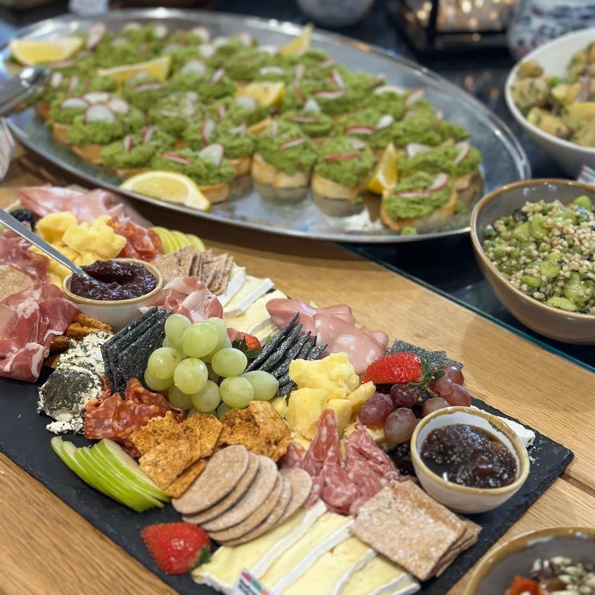 Half a pizza per guest with sides like garlic bread and mozzarella sticks. Options include Margherita, BBQ Chicken, Diavola, Mediterranean, and more2025 Catering Menu.Charcuterie Sharing Board – £20pp (20 portion minimum)